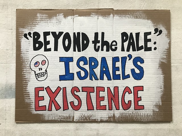 "Let me show you some of this hate-filled art," Adams said during his speech. "Putting a Jewish star on the robe of a Klansman, equating Zionism with Nazism and fascism, stating that you are a Hamas lover, and saying that Israel's existence is beyond the pale. Let me be very clear: This right here is beyond the pale."